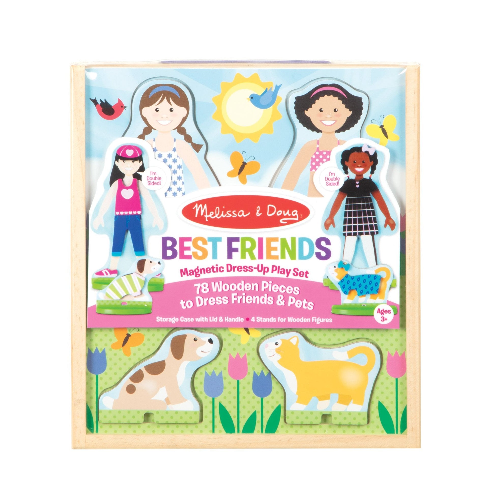 Combine dozens of magnetic pieces in coordinating designs to dress two friends and their pets (a precious puppy and cute kitten) to tell stories about these best friends! Mix and match coordinating magnetic clothing and accessories to dress the dolls.