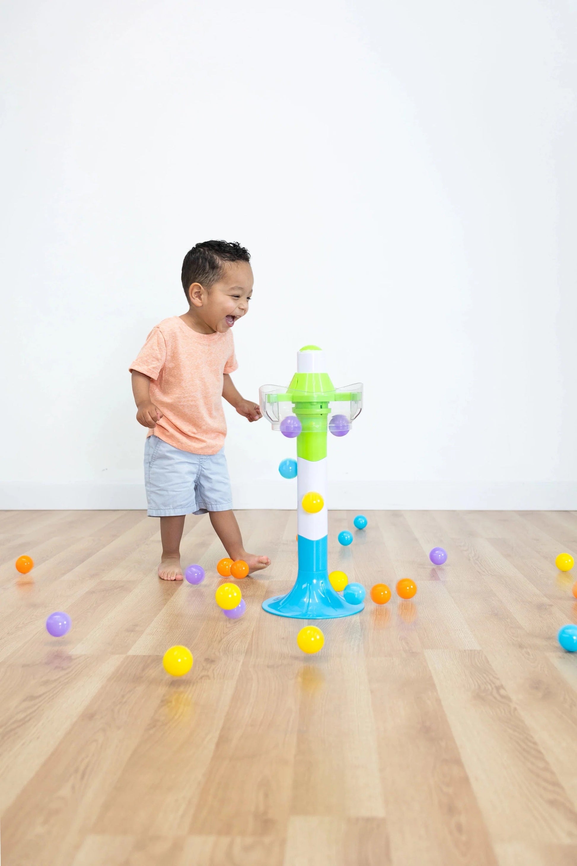 Fill the top of the tower with the 16 colorful balls and then press the button. A hidden timer starts ticking away until suddenly... CLICK.