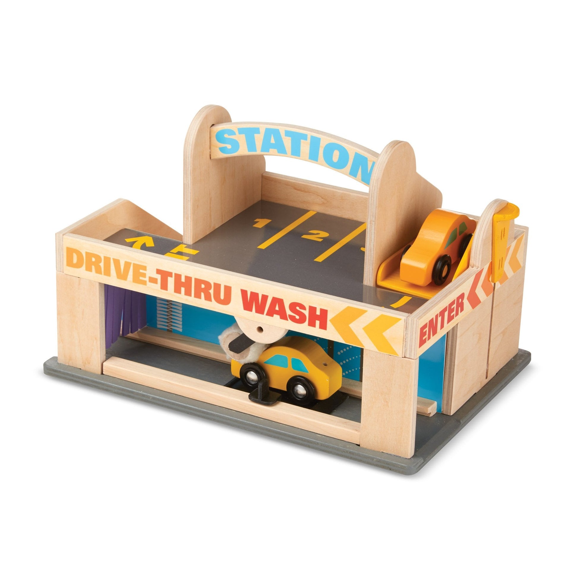 This all-in-one service station is truly full serve! Park the two included wooden cars in the parking garage with movable elevator or pull them through the car wash. Don't forget to fill up at the gas pump before getting the cars serviced at the garage
