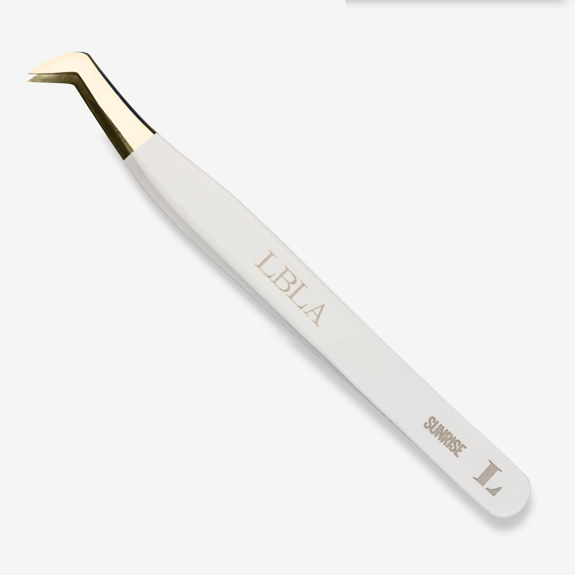 This lightweight, Gold L curved tweezer is a must have for creating smaller dimension fans, anywhere from 2D-6D with 0.07, 0.06, 0.05. It has an ultra defined tip making it perfect for maximum precision in volume lashing. The smooth, curved tip makes it effortless to roll fans open when fanning on the strip.