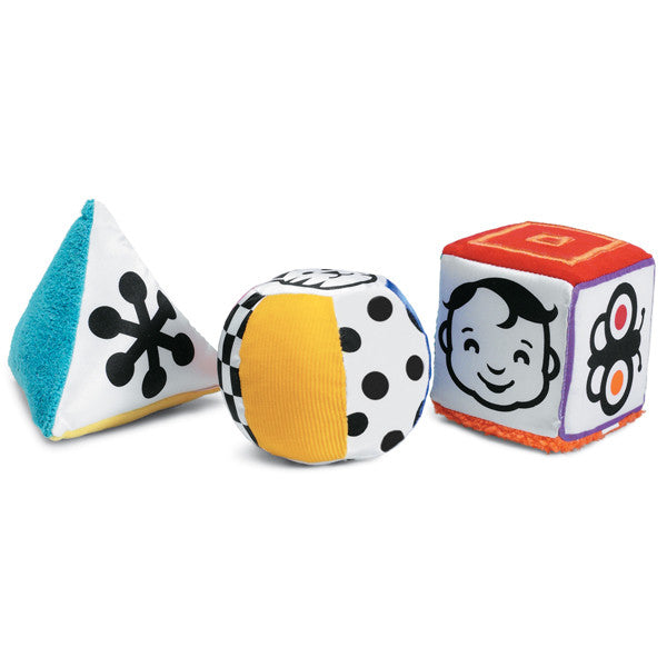 These vibrant shapes encourage babies to look, touch, and listen. Each easy-to-carry shape has a noisemaker and a medley of research-correct graphics and textures.